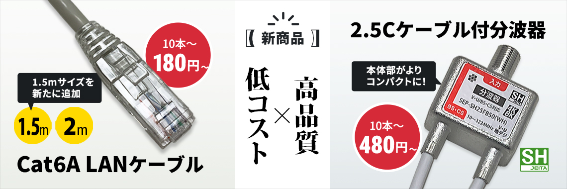 ピックアップ商品 新商品 Cat6A LANケーブル 1.5m ライトグレー Cat6Aシリーズに、1.5mサイズを新たに追加!高品質とコストバランスを両立!全数FLUKE検査済 新商品 Cat6A LANケーブル 2m ライトグレー 現行販売中のCat6Aの2mよりも安価!高品質とコストバランスを両立!全数FLUKE検査済 新商品 【SH登録】2.5Cケーブル付分波器 現行販売品よりも本体部サイズがコンパクトな2.5Cケーブル付分波器が新登場!SHマーク登録済! お買い得商品 光ドロップケーブル 2心テープ 1000m 発泡ドラム お試しセール実施中!通常価格 1巻 37,000円 のところ 31,000円 でご提供(2026年1月16日まで) お買い得商品 光ドロップケーブル 2心素線 1000m 発泡ドラム お試しセール実施中!通常価格 1巻 32,000円 のところ 28,000円 でご提供(2026年1月16日まで) 光コネクタ 現場で組立施工する外皮把持型のSC光コネクタです。組立てには専用の治具、ホルダーを使用します。ファイバ種類:シングルモード RJ45かんたんコネクタ 専用工具でかんたん作業、特性ロスを最小限で加工できます。極数:8極8芯 適合ケーブル:Cat6A、Cat6、Cat5e、UTP、芯線:AWG 23 ケーブル径:5.5~7.2 mm プレミアムHDMIケーブル 2m プレミアムHDMI認証取得済モデル 様々な規定・基準をクリアしています。カテゴリ:Premium High Speed HDMI Cable with Ethernet 規格認証品 プレミアムHDMIケーブル 3m プレミアムHDMI認証取得済モデル 様々な規定・基準をクリアしています。カテゴリ:Premium High Speed HDMI Cable with Ethernet 規格認証品 人気商品 Cat6A LANケーブル 300m ライトグレー 箱入りで持ち運びに便利な、屋内用Cat6ALANケーブル 300m。ケーブル径が細いので、通線作業が楽にできます 人気商品 Cat6 LANケーブル 300m ライトグレー 持ち運びに便利な箱入り、Cat6LANケーブル 300m。ケーブル径が細いので、通線作業が楽にできます 人気商品 Cat5e LANケーブル 300m ライトグレー 箱入りで持ち運びに便利な、屋内用Cat5eLANケーブル 300m。ケーブル径が細いので、通線作業が楽にできます
